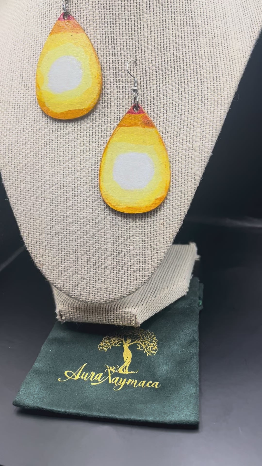 Brighten your look with these hand-painted wooden earrings, inspired by the warm glow of the sun. Crafted from lightweight wood, each teardrop-shaped earring features a radiant blend of yellow, orange, and white tones, evoking the energy and positivity of sunshine. The artistic brushwork ensures every pair is one-of-a-kind, making them a cheerful statement piece for any outfit.
